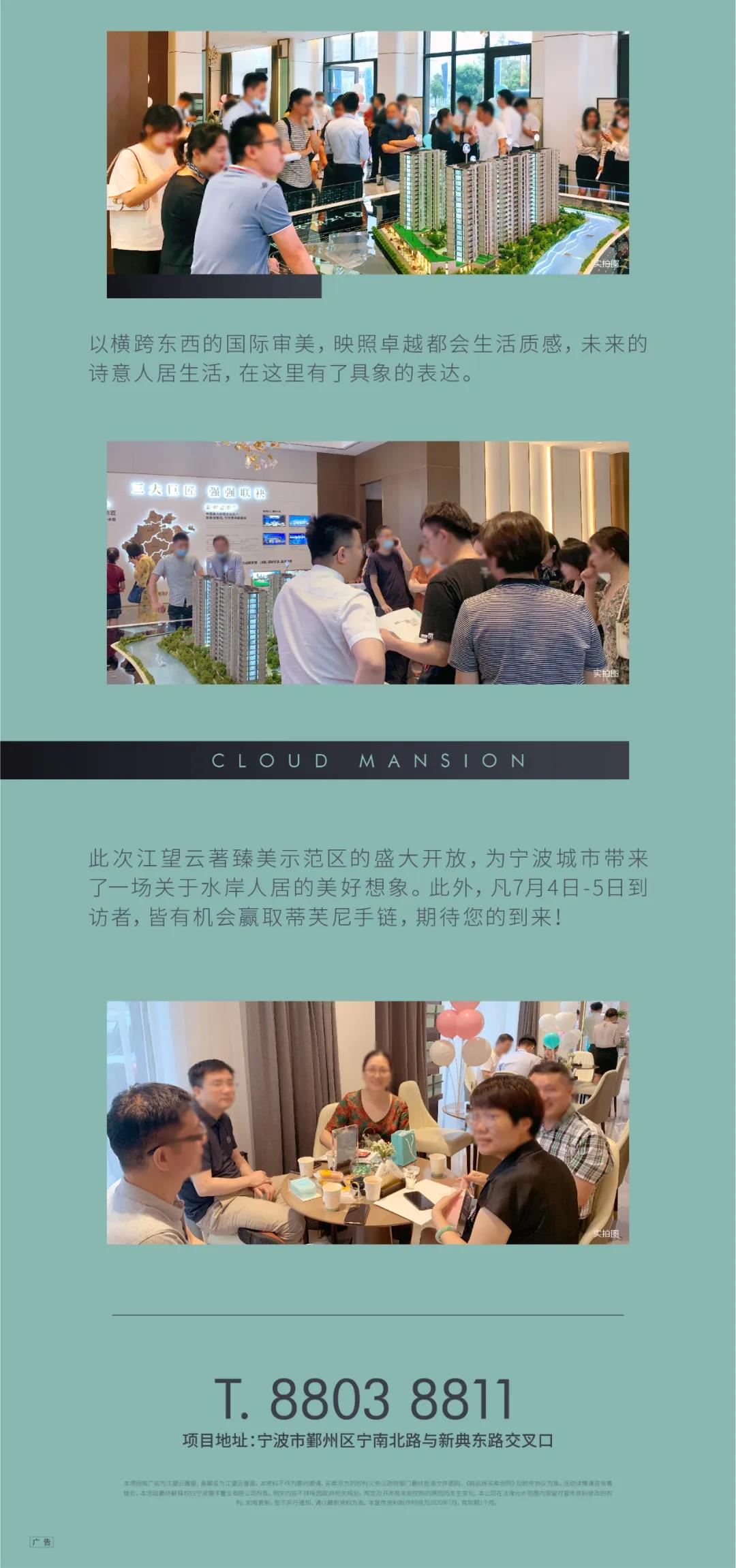 7月4日,,,,,,,江望云著臻美树模区惊艳开放,,,,,,,在万众瞩目中正式揭开神秘面纱,,,,,,,傲立于奉化江畔,,,,,,,坐享周边商业配套,,,,,,,3公里规模内各大都会地标加持,,,,,,,为宁波都会带来了一场关于水岸人居的优美想象。。。。。。。。
